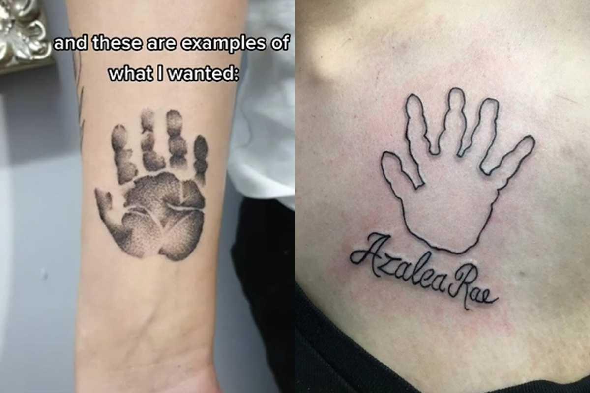 Porém, o resultado foi totalmente diferente do esperado e a mulher ficou traumatizada com a situação. Ao invés das impressões das mãos, a mulher ganhou um contorno muito estranho junto do nome da menina, Azalea Rae.