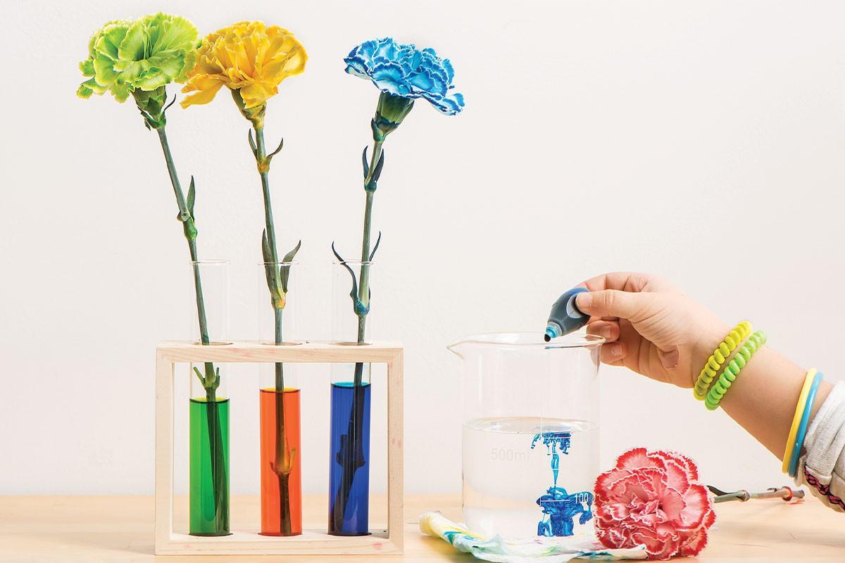 - 2. Adicione aproximadamente 20 gotas de corante em cada vaso. Seja generoso – você quer que a cor da água seja bem evidente.