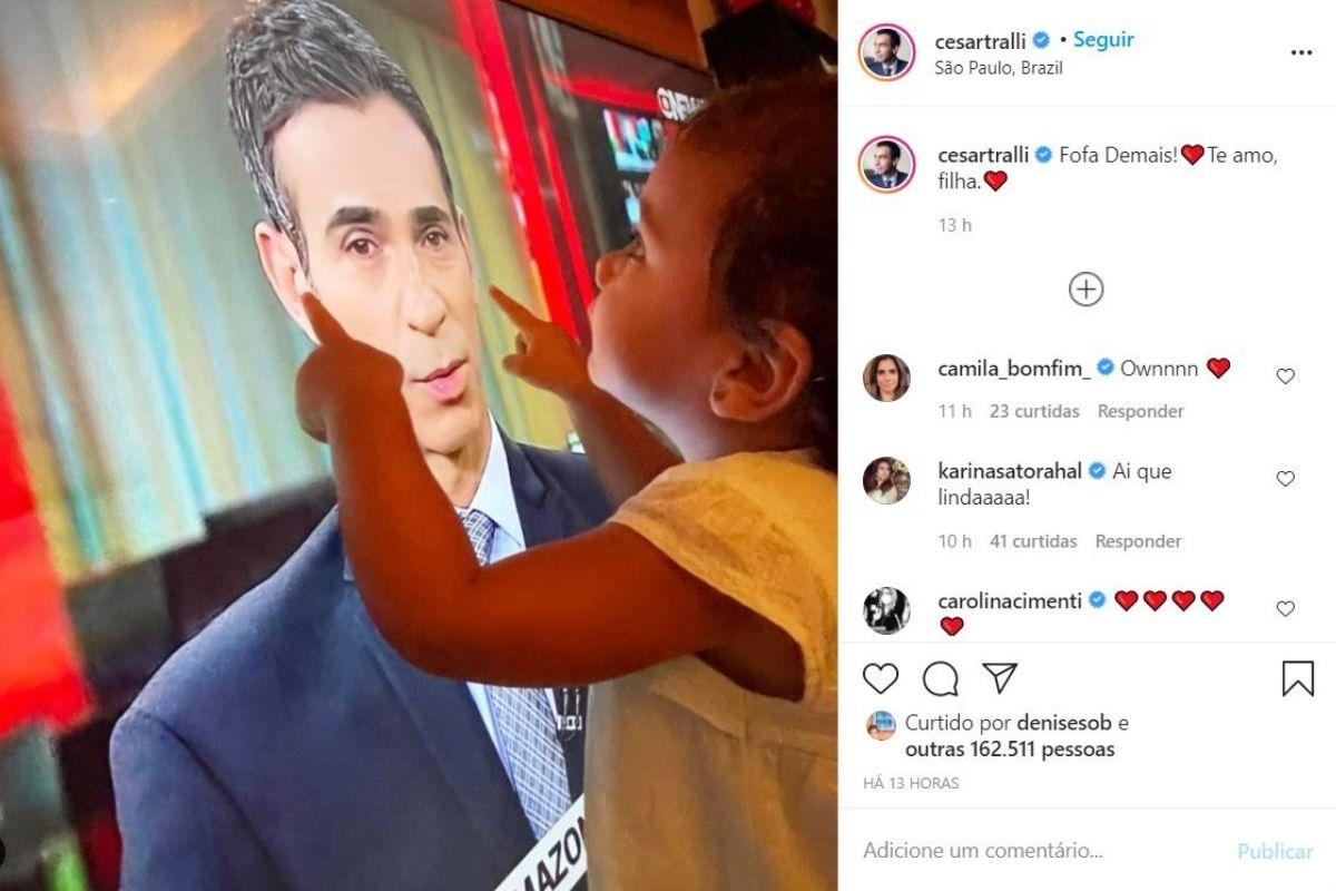 Na legenda da publicação, o jornalista se derreteu pela filha: “Fofa Demais. ❤️Te Amo, Filha❤️”. Diante da foto, os seguidores não dispensaram os elogios para a fã número um de Cesar Tralli. “Que delícia”, disse uma internauta. “Muito fofa”, comentou outra. “É muito sua fã”, afirmou um terceiro. “Que linda, reconheceu o papai na tv”, escreveu putro.