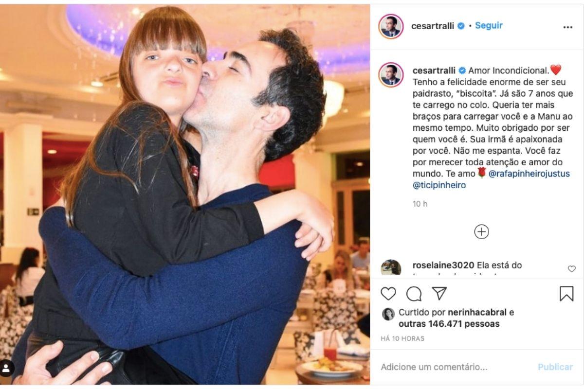 Na imagem César aparece dando beijo na bochecha da pequena que olha para a câmera, os seguidores se encantaram com a imagem e encheram a publicação de elogios. “Mas que lindo esse Tralli e essa Rafinha, gente”, disse uma internauta. “Muito amor envolvido”, escreveu mais uma. “Amor maior do mundo”, concluiu um terceiro.