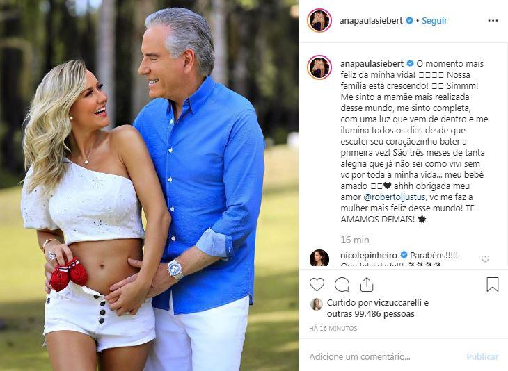 No domingo, 3 de novembro, Ana Paula Siebert usou seu Instagram para dar a notícia aos seguidores. No perfil, a esposa de Roberto Justus contou para os fãs que está no 3º mês da gestação.