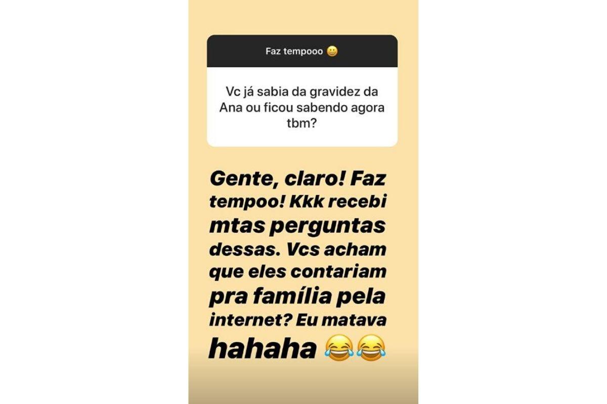 “Você já sabia da gravidez da Ana ou ficou sabendo agora também?”, perguntou um seguidor. “Gente, claro! Faz tempo! Kkk Recebi muitas perguntas dessas. Vocês acham que eles contariam para a família pela internet? Eu matava hahahaha”, brincou Fabiana.