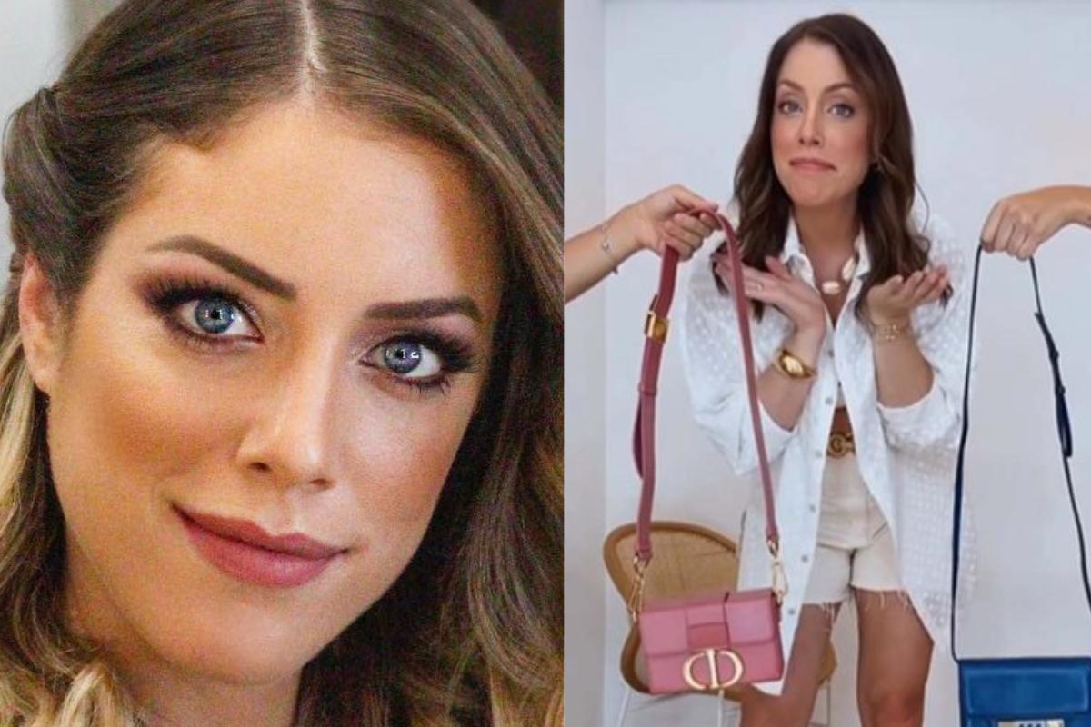 A mãe fez um vídeo montando um look do dia e, no final, escolheu entre uma bolsa rosa ou uma bolsa azul para representar o sexo da criança. Com um look todo branco, ela pegou a bolsa azul para compor o visual, revelando que terá um menino.