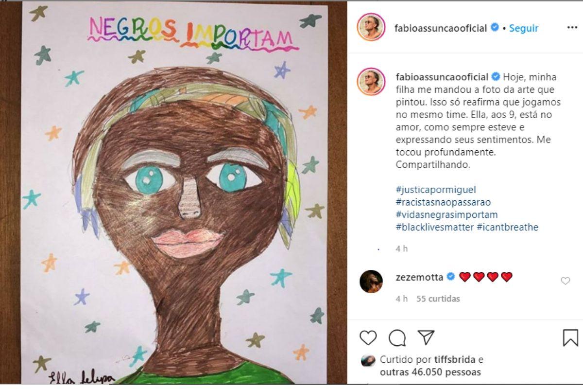 Nesta sexta-feira, 5 de junho, Fabio Assunção compartilhou em suas redes sociais, o desenho que sua filha, Ella Felipa de 9 anos, fez inspirada no caso de Miguel, o menino preto de 5 anos ano de idade, que morreu ao cair do nono andar de um prédio. Ella além de desenhar o garoto, escreveu na folha: “Negros importam”