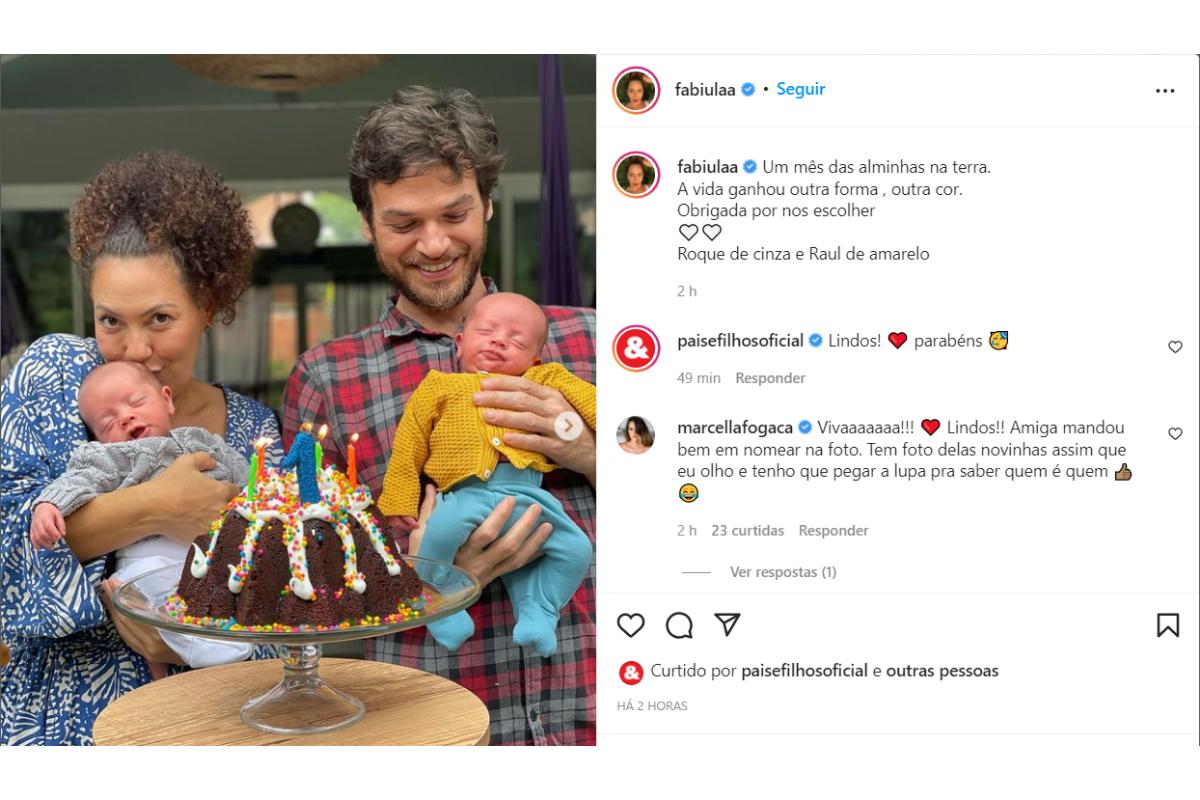 “Um mês das alminhas na terra. A vida ganhou outra forma , outra cor. Obrigada por nos escolher. Roque de cinza e Raul de amarelo”, escreveu Fabiula Nascimento na legenda da publicação. Acompanhada pelo parceiro, Emílio Dantas comemorou: “Um mês de muita correria, muitas aventuras e amor escorrendo por todos os cantos dessa casa. Amo vocês duplinha”.