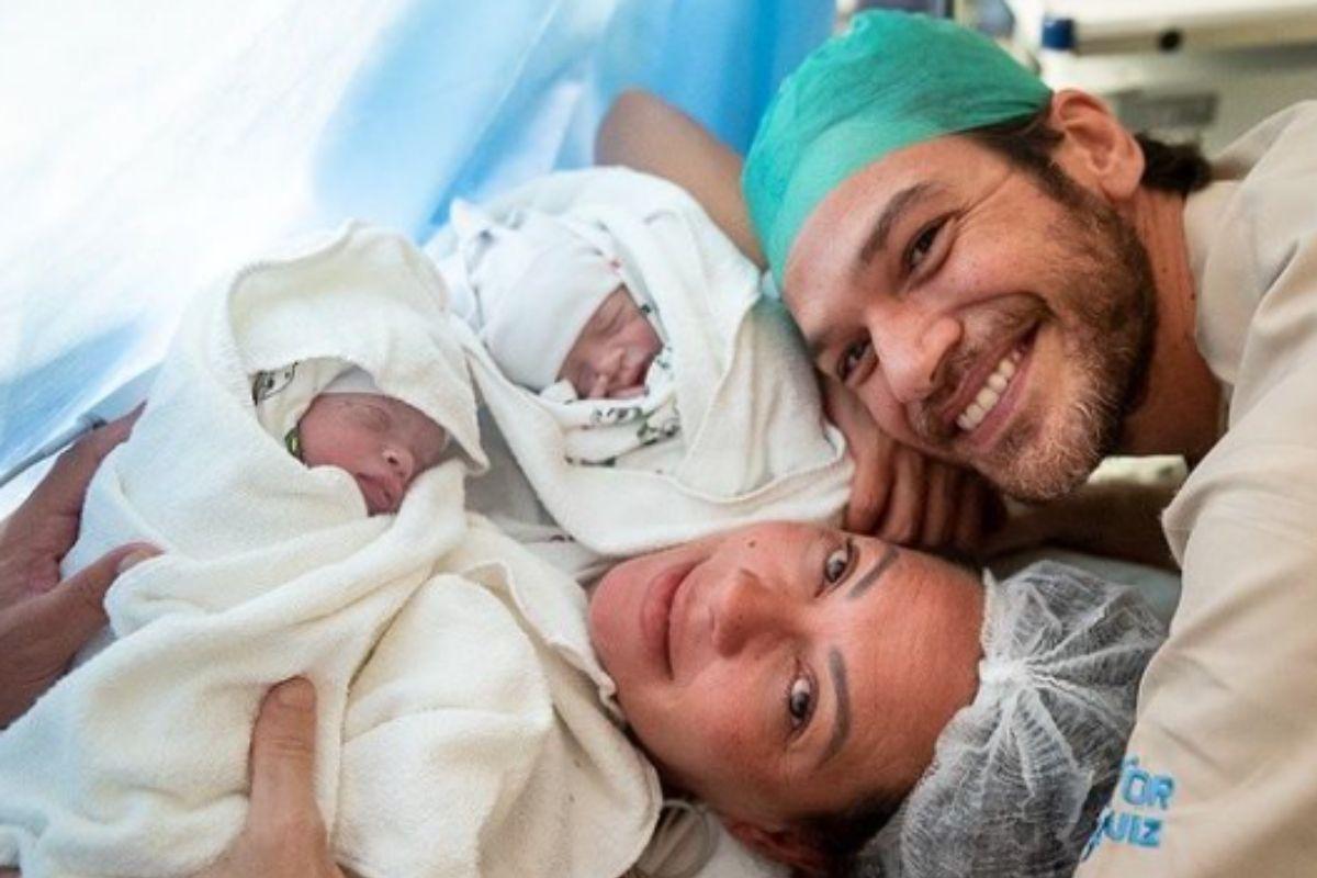 A atriz compartilhou uma montagem mostrando duas fotos, uma antes do nascimento dos gêmeos e outra depois. Na primeira foto, ela aparece segurando apenas duas roupas no colo, na segunda a artista já está nas presença dos filhos, segurando com muito carinho.