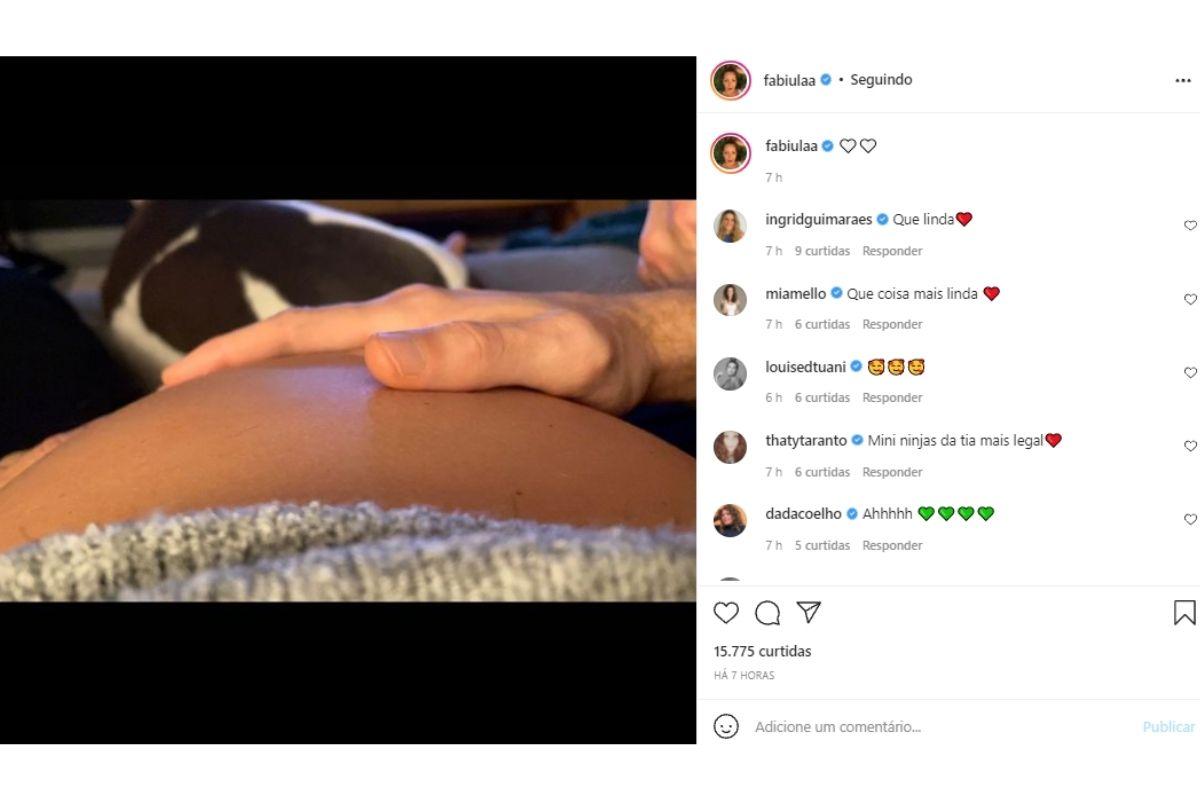 No clique, aparece o ator com a mão na barriga da artista. Fãs e amigos da família deixaram diversos comentários elogiando os pais: “Que linda”, escreveu a atriz Ingrid Guimarães. “Que coisa mais linda!”, disse Mia Mello. “Mini ninjas da tia mais legal!”, “A forma de amor!”, “Imagem mais linda não há. Ohana”, elogiaram outras pessoas.