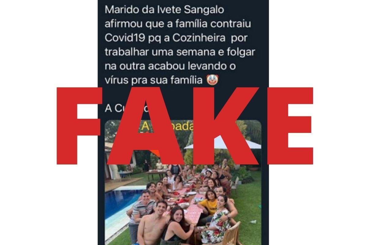 As mensagens falsas que circulam atualmente com a foto da família criticam justamente essa fala de Daniel. “Marido da Ivete Sangalo afirmou que a família contraiu Covid-19 porque a cozinheira, por trabalhar uma semana e folgar na outra, acabou levando o vírus para a sua família”, diz a mensagens, que também aponta a “culpada” sobre a foto, de forma irônica.