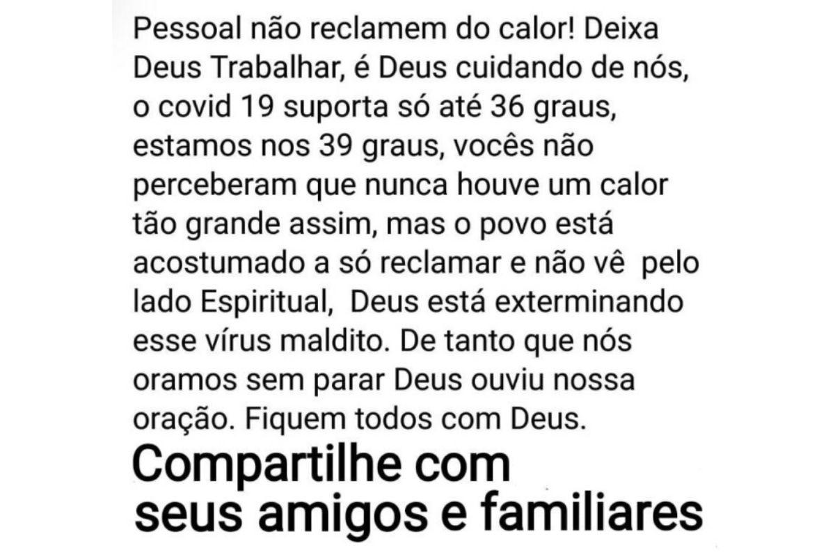 A informação que tem circulado pelas redes sociais de que o novo coronavírus não sobrevive a temperaturas superiores a 36° é falsa. “Não há comprovação científica sobre qual é a temperatura suportada pelo vírus”, apontou o infectologista Estevão Urbano, integrante do Comitê de Enfrentamento à Epidemia de Covid-19 da Prefeitura de Belo Horizonte, em entrevista ao jornal Hoje em Dia.