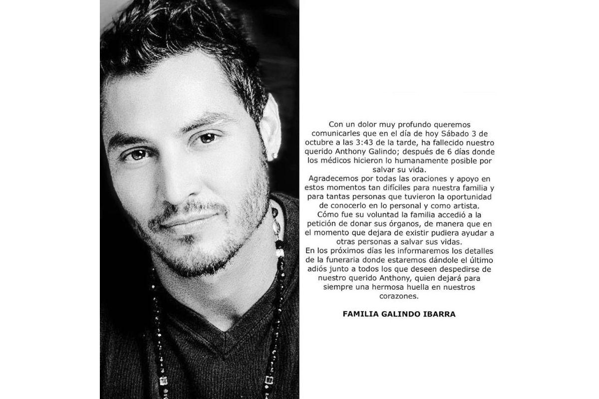 “Com muita dor, queremos informar que hoje, sábado, 3 de outubro, às 15h43, morreu nosso querido Anthony Galindo, após seis dias em que os médicos fizeram de tudo para salvar sua vida”, começou o comunicado. Anthony sofria de depressão, que acabou se agravando durante o isolamento social, causado pelo coronavírus.