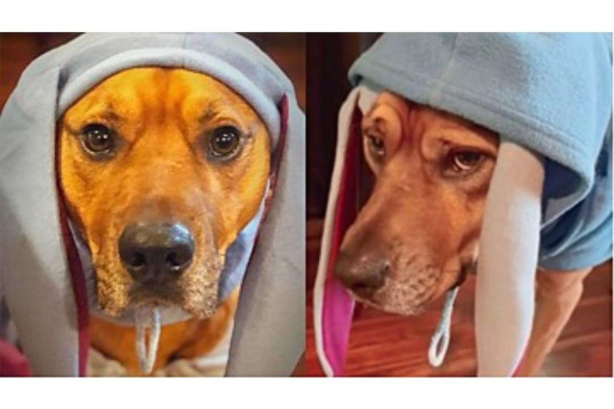“Tínhamos comprado uma fantasia de Halloween do Ió [ personagem da turma do Ursinho Pooh] para ele alguns meses atrás, então retiramos a parte com as orelhas caídas. Colocamos nele e ele instantaneamente ficou muito quieto e calmo”, contou a dona do animal.