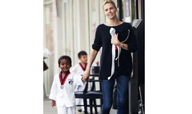 A atriz sul-africana Charlize Theron e seu filho, Jackson. Ela recentemente resolveu aumentar a família e adotou uma menina também, chamada August (Foto: Reprodução)
