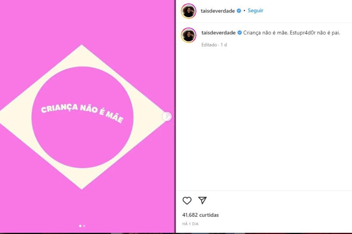 A atriz Taís Araújo, postou: “Criança não é mãe. Estuprador não é pai.”