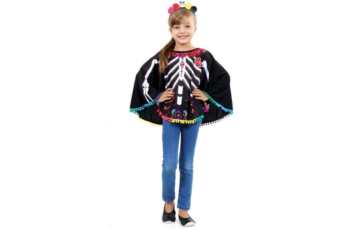 Fantasias de caveiras e esqueletos não podem ficar de fora, tem tudo a ver com o tema da festa de Halloween! Esse é um poncho com a estampa de Caveira Mexicana. Os detalhes coloridos como as flores e outros desenhos dão um char especial, além da barra ser toda de pompom colorido. Sua filha pode usar com um acessório de cabeça com flores que vai complementar o look. Para comprar na Amazon com 15% de desconto é só clicar AQUI.