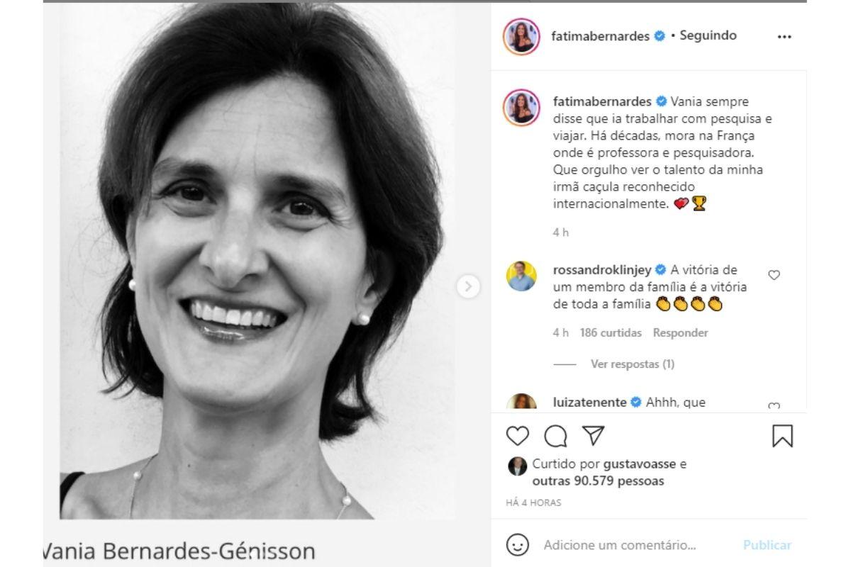“Vania sempre disse que ia trabalhar com pesquisa e viajar. Há décadas, mora na França onde é professora e pesquisadora. Que orgulho ver o talento da minha irmã caçula reconhecida internacionalmente”, escreveu ela na publicação. Junto com a homenagem, Fátima compartilhou uma foto da irmã e uma série de reportagens francesas que citam o nome dela.