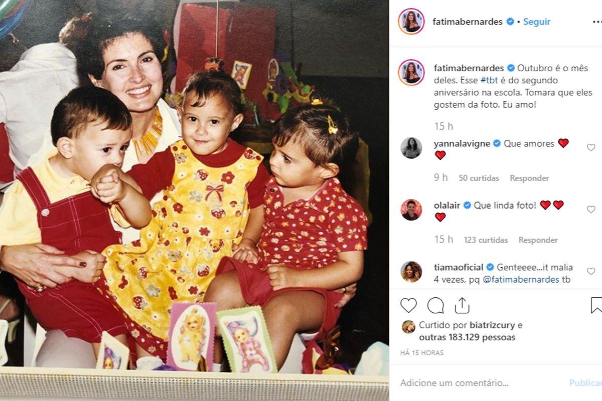 Fátima Bernardes, mãe de Beatriz, Vinicius e Laura, entrou de verdade no clima da semana da criança e emendou a data com TBT. A apresentadora aproveitou todos esses eventos e voltou para quando os filhos ainda eram bebês e encantou a internet.