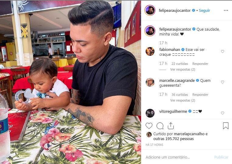 O cantor Felipe Araújo compartilhou uma foto, com o filho Miguel, comemorando o 11º mesversário do menino que é fruto do relacionamento do cantor com Caroline Marchezi.