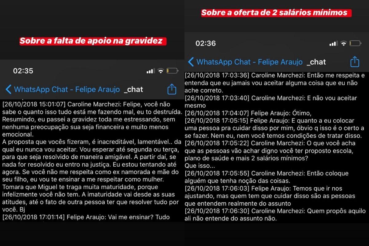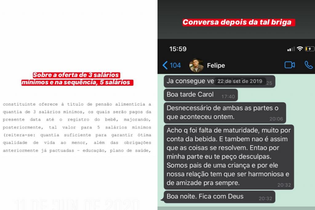 A assessoria de imprensa do cantor desmentiu o que Carol revelou aos fãs e esclareceu: “A defesa de Felipe Araújo refuta veemente todas as alegações feitas. A defesa ainda informa que Felipe jamais ajuizou qualquer ação para reduzir a pensão alimentícia do filho Miguel. Esclarece que QUANDO A SRA CAROLINE ESTAVA GRÁVIDA DE 7 MESES, FELIPE AJUIZOU UMA AÇÃO DE FIXAÇÃO DE ALIMENTOS GRAVÍDICOS (ou seja, antes mesmo da realização de exame de DNA). A defesa de Felipe informa que paga mensalmente ao menor Miguel o valor fixado pelo poder judiciário, e, que mesmo sem realizar qualquer show há mais de 3 três meses vem cumprindo fielmente com o determinado pela decisão judicial”.