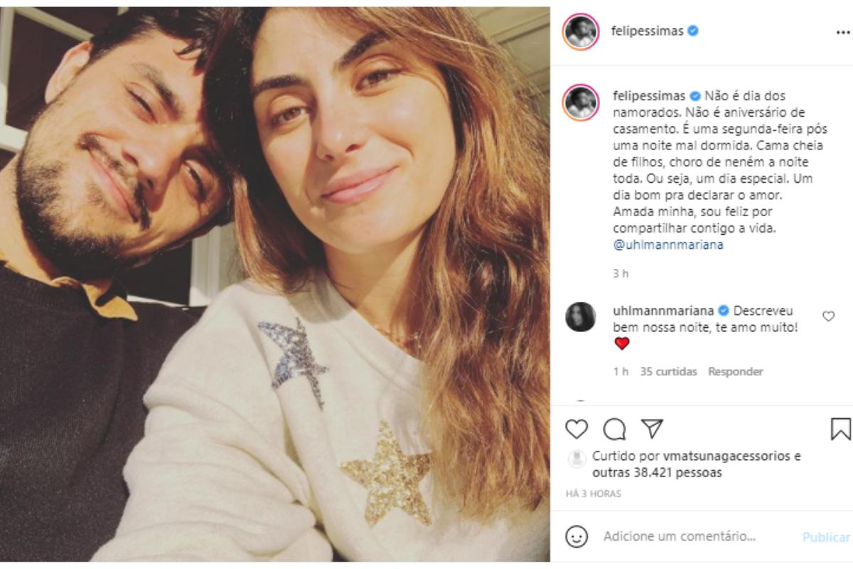 “É uma segunda-feira pós uma noite mal dormida. Cama cheia de filhos, choro de neném a noite toda. Ou seja, um dia especial”, declarou Felipe. “Não é dia dos namorados. Não é aniversário de casamento“, ainda falou, “Um dia bom pra declarar o amor. Amada minha, sou feliz por compartilhar contigo a vida”.