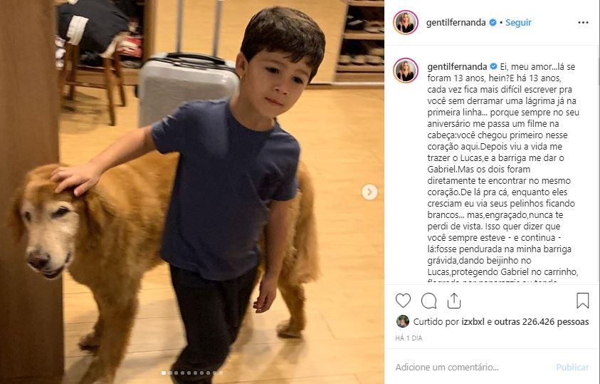 “Há 13 anos cada vez fica mais difícil escrever pra você sem derramar uma lágrima já na primeira linha… Porque sempre no seu aniversário me passa um filme na cabeça: você chegou primeiro nesse coração aqui. Depois viu a vida me trazer o Lucas, e a barriga me dar o Gabriel. Mas os dois foram diretamente te encontrar no mesmo coração”, disse Fernanda na legenda da publicação.