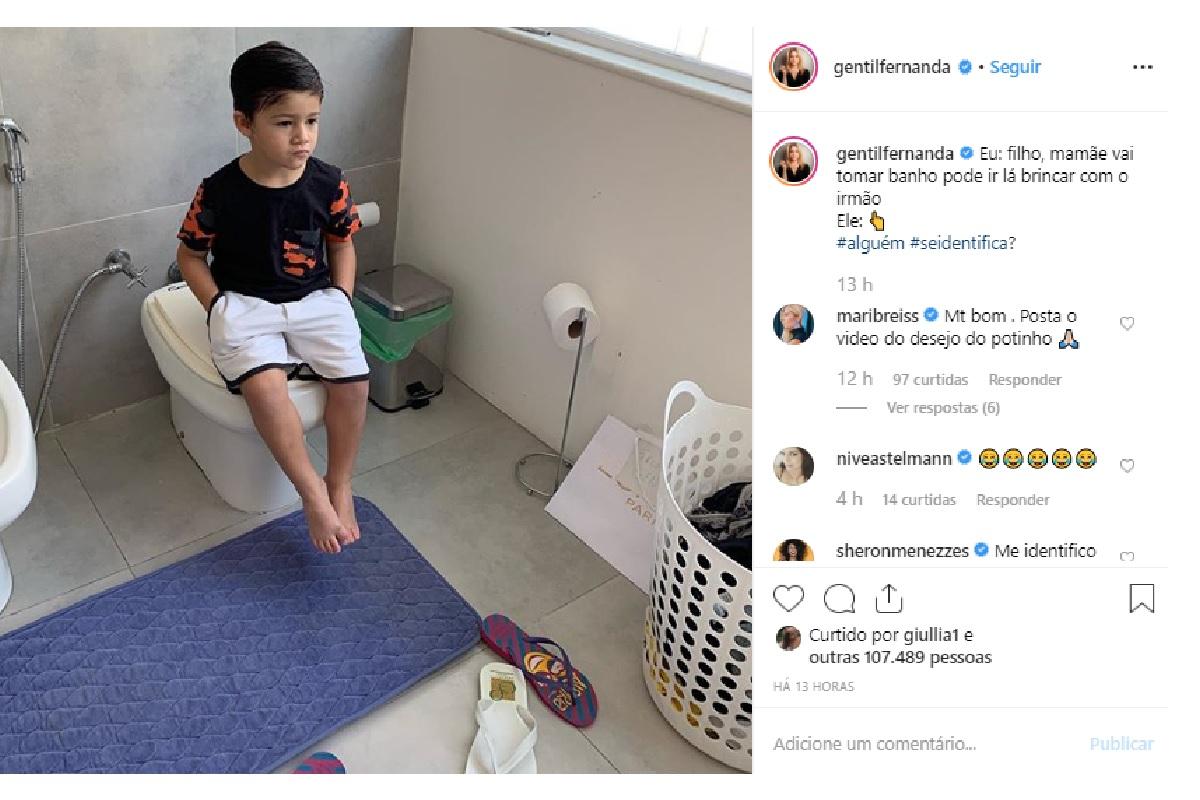 O menino de apenas 4 anos está sentado no vaso sanitário enquanto a mãe toma banho e a apresentadora explica a situação. “Eu: filho, mamãe vai tomar banho pode ir lá brincar com o irmão. Ele: …”, escreveu Fernanda.