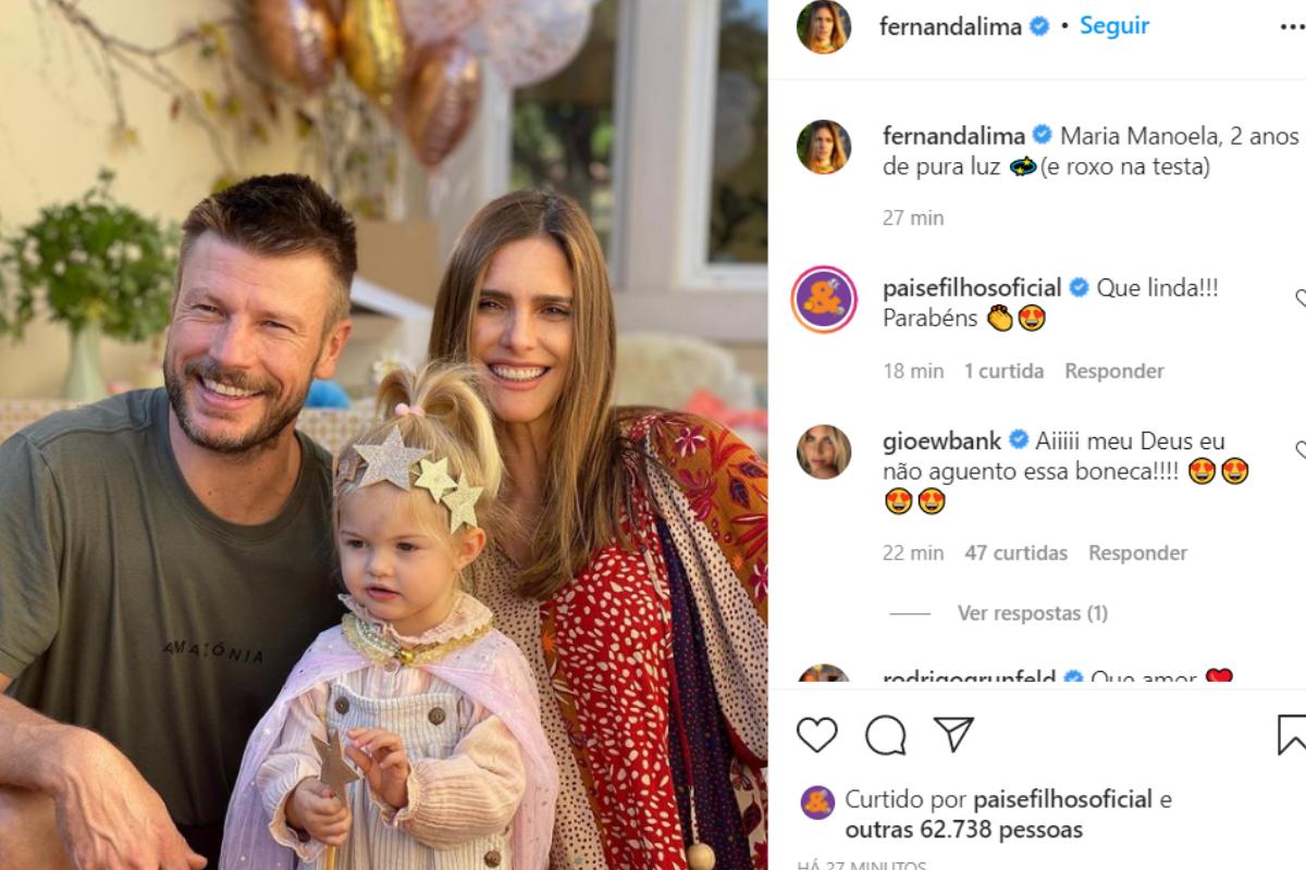 Dia de festa! A apresentadora Fernanda Lima, de 44 anos de idade, publicou nesta sexta-feira, dia 27 de outubro, uma foto celebrando o aniversário de 2 anos da caçula, Maria Manoela.