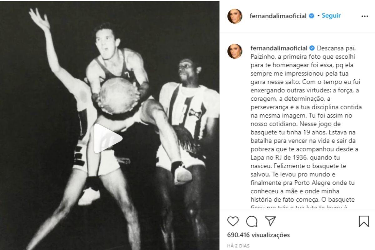 Na publicação, Fernanda ainda contou como foram os últimos momentos ao lado do pai. Segundo ela, as condições impostas pela pandemia não permitiram com que ela se despedisse como gostaria. “Foi cruel não poder estar ao teu lado durante o processo todo. A única vez que consegui deixar minha bebê para pegar um avião e ir te visitar, tu já não estava mais na UTI. Fiquei abraçada em ti ouvindo essa musica do Cartola que tu tanto adorava. Eu chorava vendo teu olhar vago e observava tuas lágrimas escorrerem também. Espero que tenhas ouvido tudo que falei no teu ouvido”, finalizou.