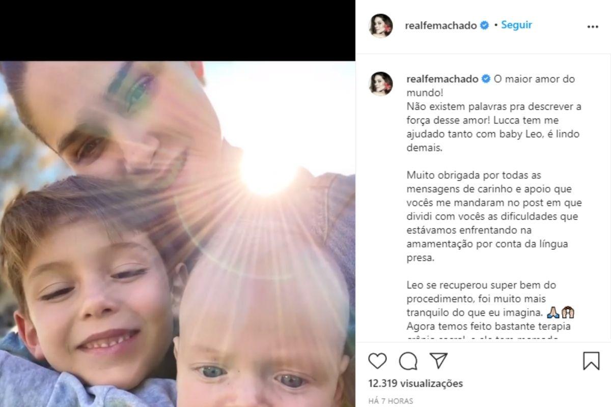Fernanda Machado deixou os seguidores de coração mole nesta quarta-feira, 11 de novembro, ao publicar um vídeo sobre os filhos, Lucca, de 5 anos, e Leo, de quase 5 meses. A atriz mostrou várias fotos dos irmãos e escreveu um texto sobre a relação especial que tem com os dois, além de contar para os fãs sobre como anda a amamentação do caçula.