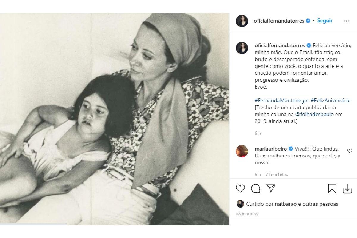 Ela ainda explicou na sequência que o texto veio de um trecho de uma carta que ela publicou em uma coluna no jornal Folha de São Paulo em 2019, mas que continua bastante atual. Nos comentários, os fãs das atrizes, cumprimentaram Fernanda Montenegro.