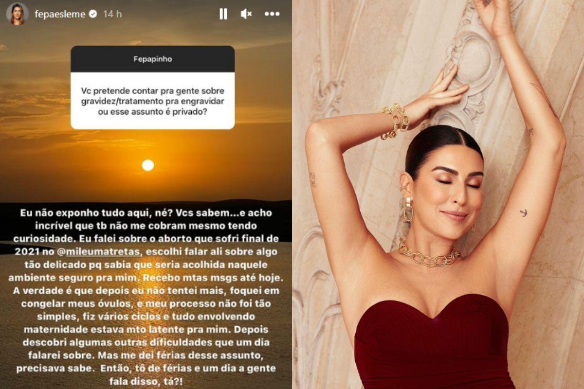 A atriz e apresentadora Fernanda Paes Leme respondeu algumas perguntas de seus seguidores em sua rede social. A atriz, que sofreu um aborto espontâneo em 2021, foi questionada se ainda tem vontade de engravidar.
