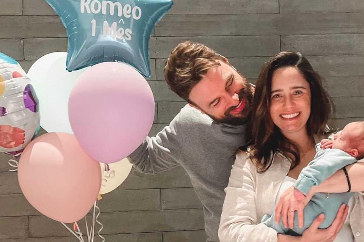 Os atores Fernanda Vasconcellos e Cássio Reis compartilharam na quinta-feira do dia 28 de julho, um registro do primeiro mês do filho Romeo. Na foto, eles aparecem com vários balões de festa, e um deles se destaca por estar escrito: “Romeo, 1 mês” em formato de estrela. Fernanda Vasconcellos aparece com o bebê no colo, enquanto Cássio Reis olha para ele com admiração.