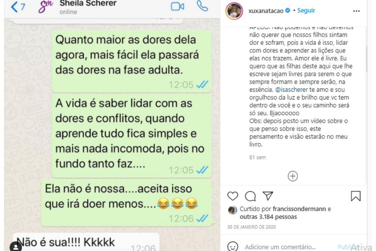 Nas mensagens, o pai de Brenda relata para Sheila, “Quanto maior as dores dela agora, mais fácil ela passará das dores na fase adulta. A vida é saber lidar com as dores e conflitos, quando aprende tudo fica simples e mais nada incomoda, pois no fundo tanto faz”. Xuxa ainda diz, “Ela não é nossa… Aceita isso que irá doer menos”. Em resposta, a mãe brinca, “Não é sua!!!!”.