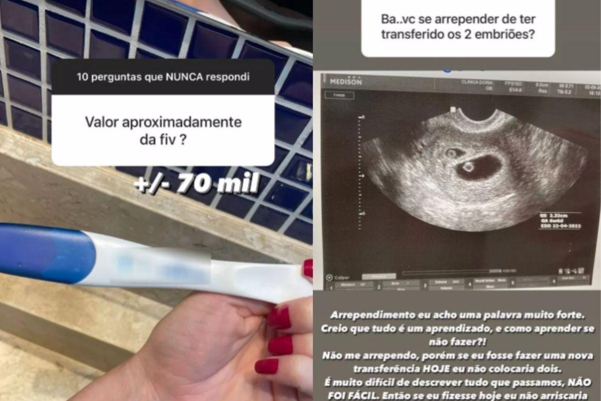 “Valor aproximado da fertilização in vitro?”, perguntou um dos seguidores. “Mais ou menos 70 mil reais”, respondeu a artista, que passou aproximadamente cinco meses tomando hormônios durante o período de tratamento para engravidar, devido a uma a endometriose e cirurgia feita no ovário.