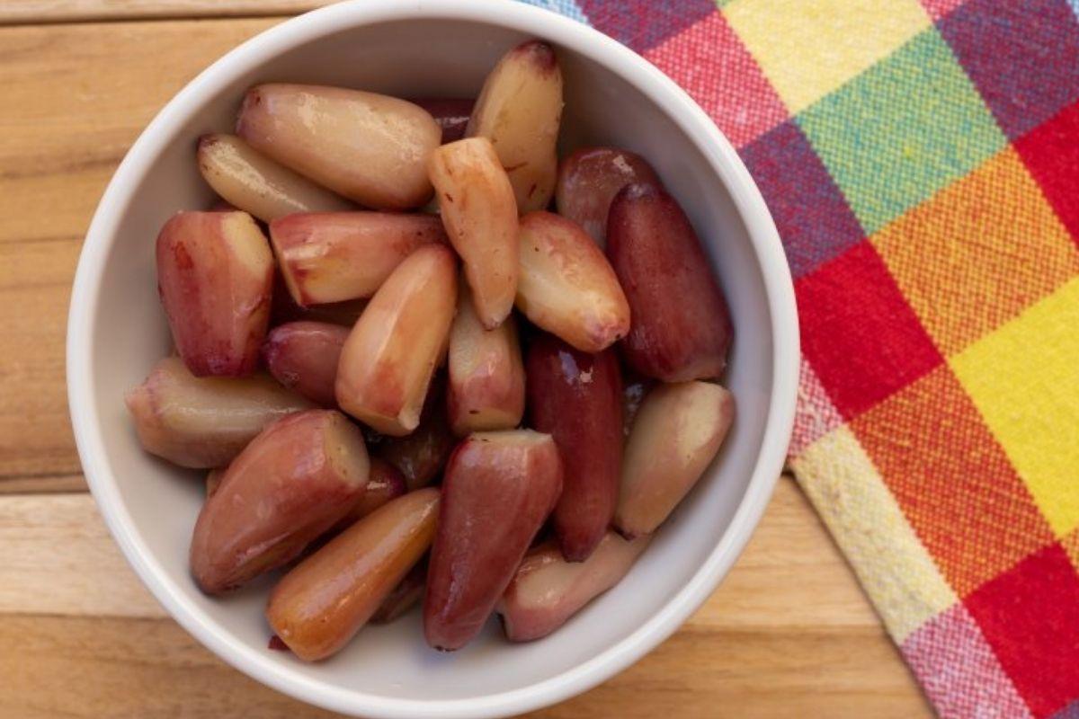 Escolha os pinhões, lave-os e corte as pontas dos mesmos. Coloque os pinhões na panela de pressão e adicione a água e o sal, leve ao fogo e quando a panela começar a “chiar” conte 30 minutos. Esse tempo é suficiente para que os pinhões estejam macios. Desligue o fogo e deixe a panela esfriar, escorra a água.