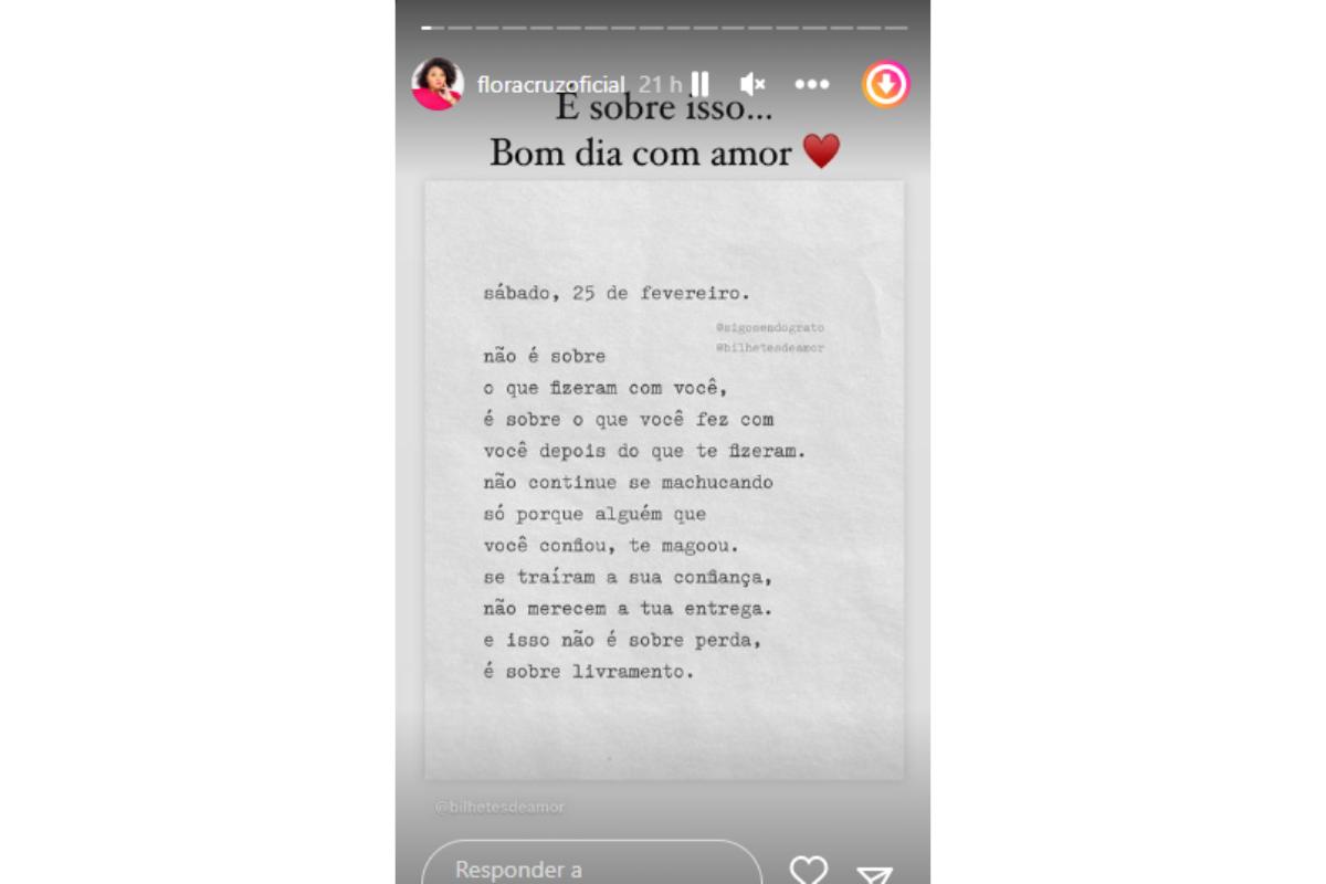 Primeiro, ela publicou um texto: “Não é sobre você, o que fizeram com você, é sobre o que você fez com você depois do que te fizeram. Não continue se machucando só porque alguém que você confiou, te magoou. Se traíram a sua confiança, não merecem a tua entrega. E isso não é sobre perda, é sobre livramento”. Junto, ela escreveu: “É sobre isso. Bom dia com amor”.