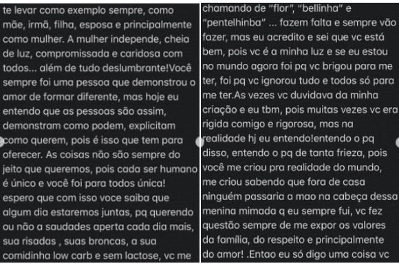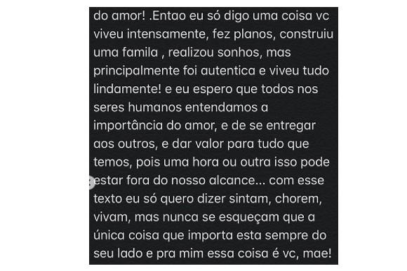 A filha fez vários elogios para a mãe e disse que se enganou quando pensou que a mãe a havia deixado. “Você nunca nunca me deixou, está comigo todos os dias, seja em lembranças, fotos, e como meu anjo da guarda. Sinto mais do que nunca você cuidando de mim, me protegendo, porém agora é lá de cima”, acrescentou.
