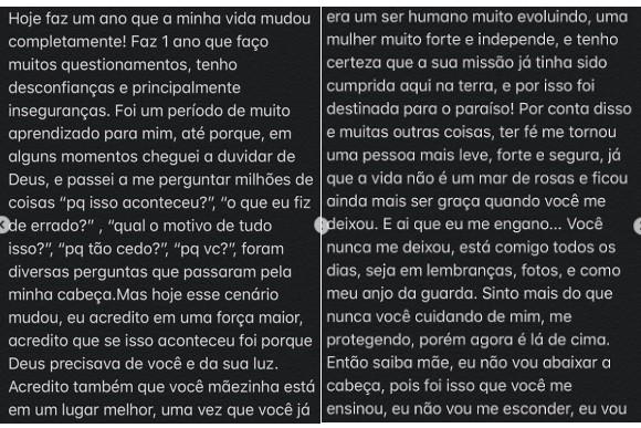 A menina de 18 anos publicou uma foto com a mãe e um vídeo antigo e colocou um “❤️” na legenda. “Hoje faz um ano que a minha vida mudou completamente! Faz um ano que faço muitos questionamentos, tenho desconfianças e principalmente inseguranças. Foi um período de muito aprendizado para mim, até porque, em alguns momentos, cheguei a duvidar de Deus. Passei a me perguntar milhões de coisas: ‘por que isso aconteceu?’, ‘o que eu fiz de errado?’, ‘qual o motivo de tudo isso?’, ‘por que tão cedo?’, ‘por que você?’”, desabafou.
