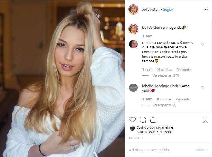 Em outra publicação de Isabelle, outra seguidora comentou: “3 meses que sua mãe faleceu e você consegue sorrir e ainda posar linda e maravilhosa. Fim dos tempos”. Mas, dessa vez, Isabelle se posicionou e decidiu responder a usuária. “Oi, tudo bem? Não sou muito de ler comentários, mas não pude deixar de ler o seu. Infelizmente uma parte de mim se foi, mas outra parte está viva e precisa se recuperar! Da mesma maneira que você, eu tive uma perda muito grande, mas meu dia a dia não é o Instagram, meu dia a dia não se resume em uma foto, eu não sou uma foto, eu não sou uma rede social!”, disse.