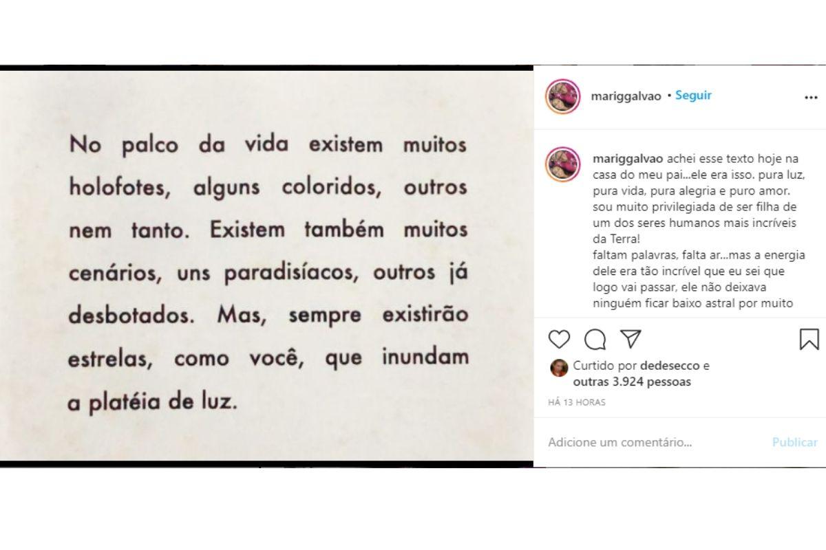 Na rede social, ela prestou uma homenagem para o pai. “Achei esse texto hoje na casa do meu pai… ele era isso. pura luz, pura vida, pura alegria e puro amor. Sou muito privilegiada por ser filha de um dos caras mais incríveis da Terra”, começou ela.