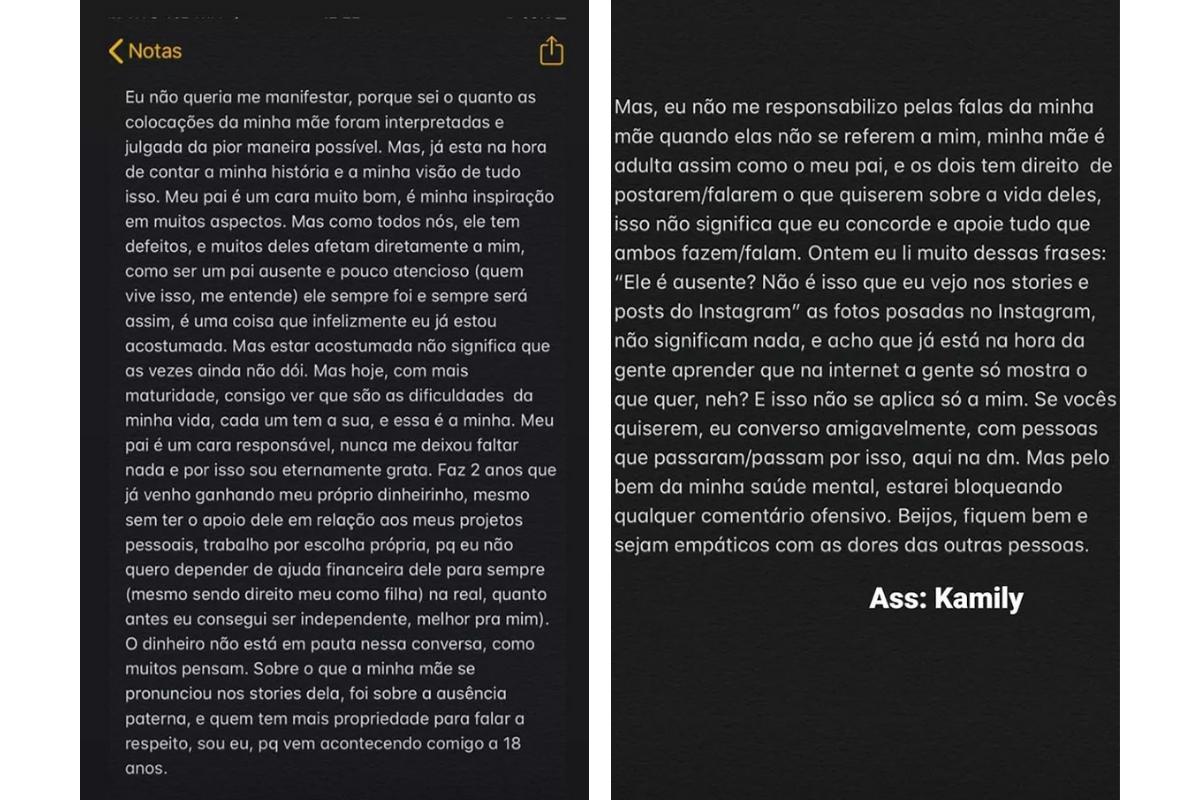 “Eu não queria me manifestar, porque sei o quanto as colocações da minha mãe foram interpretadas e julgadas da pior maneira possível. Já está na hora de contar a minha história e minha visão de tudo isso. Meu pai é um cara muito bom, é minha inspiração em muitos aspectos”, começou Kamily.
