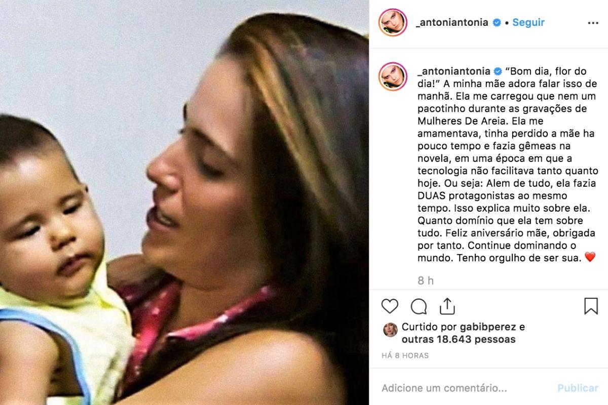 Na publicação, Antonia aparece no colo da mãe quando ainda era um bebê. Em legenda ela relata que Gloria gravou os capítulos da novela Mulheres de Areia ao mesmo tempo que cuidava da filha.