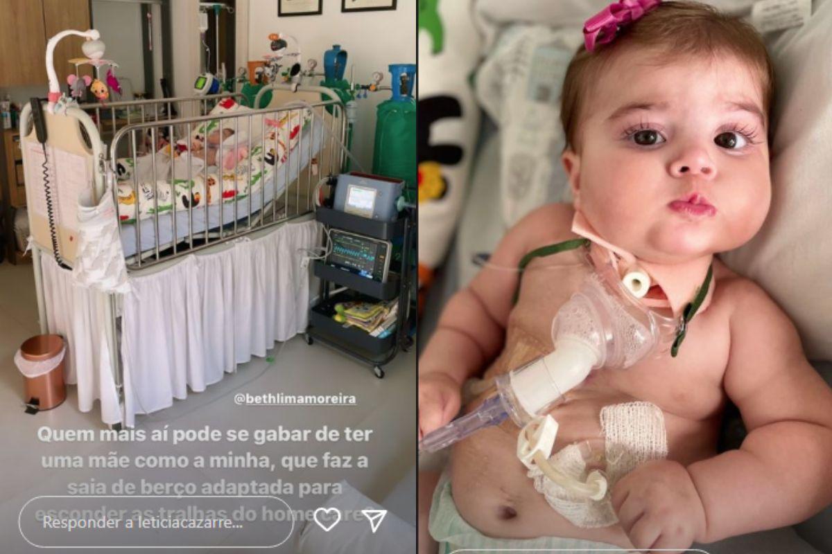 Nos Stories do Instagram, Letícia mostrou a filha fazendo caras e bocas em uma selfie. Logo em seguida ela compartilhou com os seguidores detalhes do quarto. O local que contém objetos que haviam na UTI é equipado com a aparelhagem necessária para dar suporte a continuidade do tratamento da bebê.