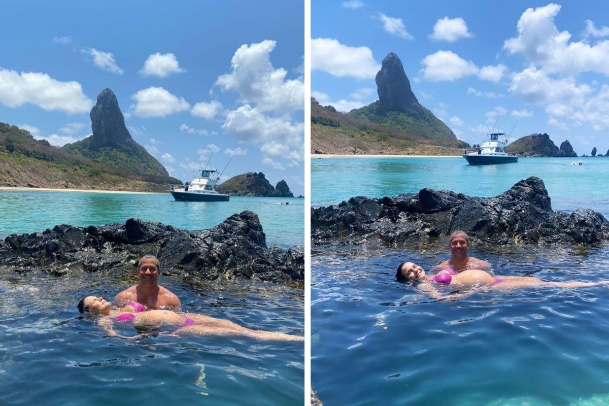 Nas imagens, pai e filha aparecem se divertindo durante mergulho no mar de Fernando de Noronha, onde a família está aproveitando as férias.