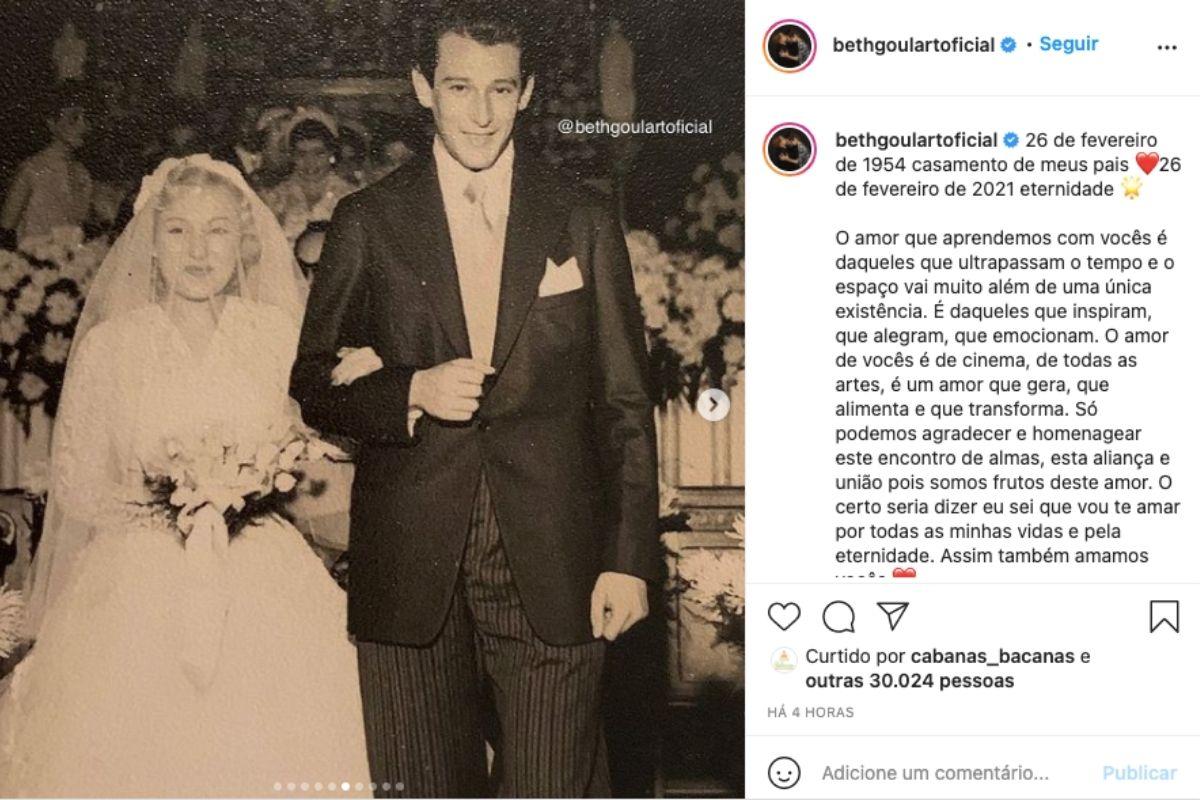 “26 de fevereiro de 1954 casamento de meus pais. 26 de fevereiro de 2021 eternidade. O amor que aprendemos com vocês é daqueles que ultrapassam o tempo e o espaço vai muito além de uma única existência. É daqueles que inspiram, que alegram, que emocionam. O amor de vocês é de cinema, de todas as artes, é um amor que gera, que alimenta e que transforma. Só podemos agradecer e homenagear este encontro de almas, esta aliança e união, pois somos frutos deste amor. O certo seria dizer eu sei que vou te amar por todas as minhas vidas e pela eternidade. Assim também amamos vocês”, declarou ela.