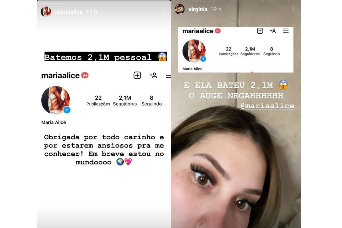 Os stories de Maria Alice também celebraram a recente legião de seguidores que os acompanha. Sobre o sucesso recente, Virginia também escreveu, “Obrigada por todo o carinho e por estarem ansiosos para me conhecer. Em breve estou no mundo”, brincou a influencer em nome da filha.