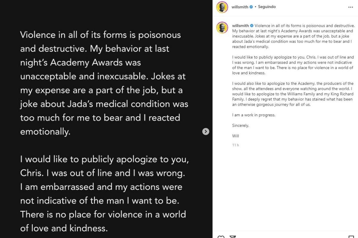 “A violência em todas as suas formas é venenosa e destrutiva. Meu comportamento no Oscar de ontem à noite foi inaceitável e imperdoável. Piadas às minhas custas fazem parte do trabalho, mas uma piada sobre a condição médica de @jadapinkettsmith era demais para mim e reagi emocionalmente.”, começou o texto.
