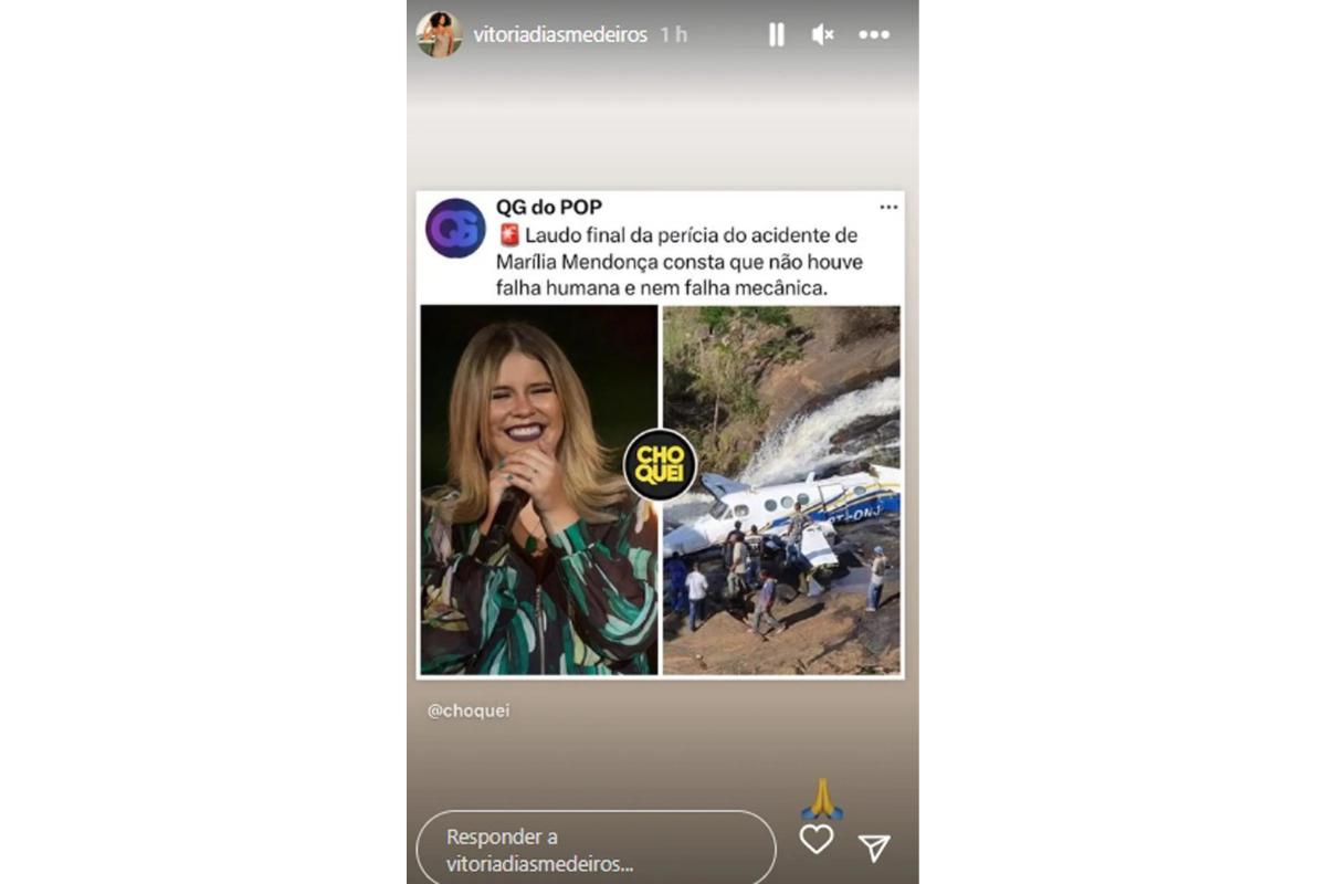 Vitória Dias Medeiros, filha de Geraldo Medeiros Júnior, piloto da aeronave que transportava Marília Mendonça, expressou sua reação diante do laudo do acidente divulgado nesta segunda-feira, dia 16 de maio, no qual foi concluído que não houve falha humana ou mecânica no acidente.