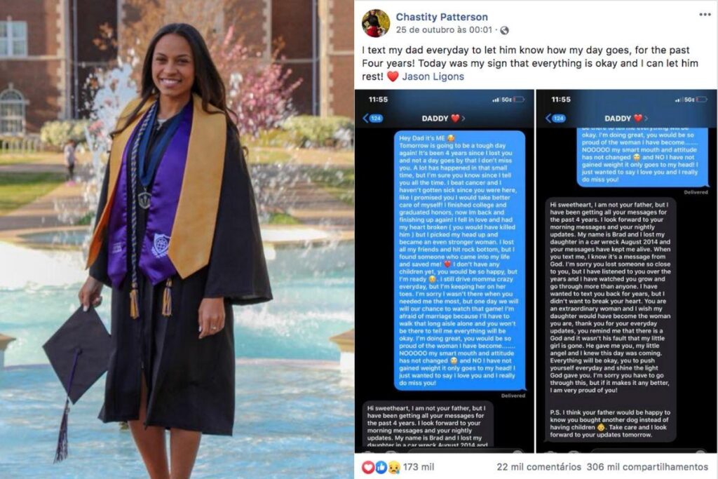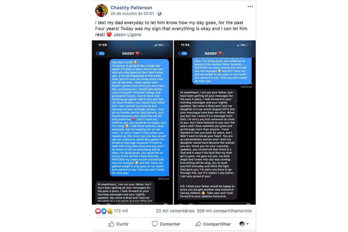 Um desconhecido respondeu a mensagem que Chasity enviou contando sobre o seu dia. A pessoa em questão se se chama Brad e contou que sua filha morreu durante um acidente de carro 5 anos atrás e se manteve forte graças às mensagens que recebeu ao longo do tempo. Na publicação, a jovem mostra prints das mensagens enviadas e respondidas. “Hoje eu tive meu sinal de que tudo está ok e eu posso deixá-lo descansar”, escreveu em legenda
