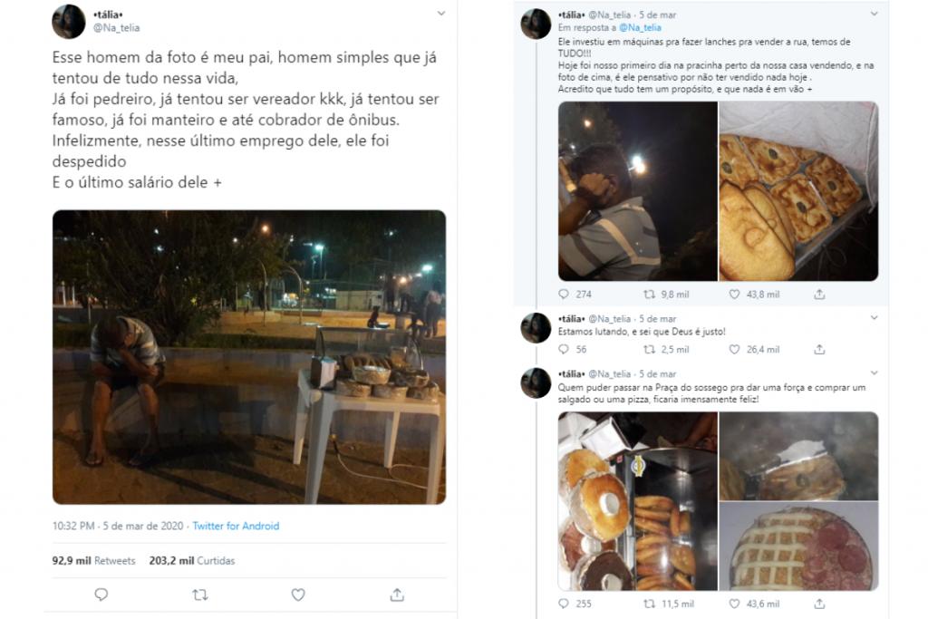 Na última quinta, 5 de março, Natália Cristina dos Santos, de 16 anos, usou o Twitter para desabafar. A menina comentou sobre o trabalho do pai, Agrinaldo dos Santos, de 51 anos. Ele vende salgados e bolos na Praça do Sossego, no bairro do Pantanal, em Duque de Caxias.