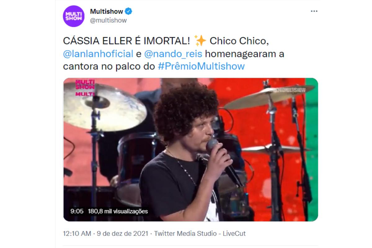 Apelidado como Chico Chico, Francisco Eller se apresentou como forma de tributo à artista, que faleceu há 20 anos atrás em decorrência de três paradas cardíacas. Além dele, o prêmio também contou com a presença de Nando Reis, grande amigo de Cássia Eller, e Lan Lahn, percussionista que chegou a trabalhar com a cantora. Para ver este conteúdo, clique aqui!